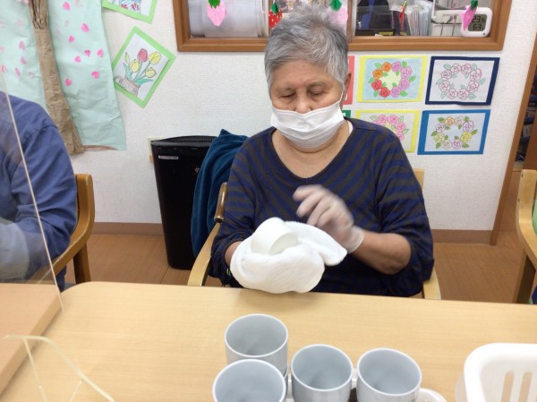 片手で食器を落とさないように持ち片方で布巾を動かす。水滴が綺麗に拭けたか確認する。簡単な動作のようで意外に難しい。