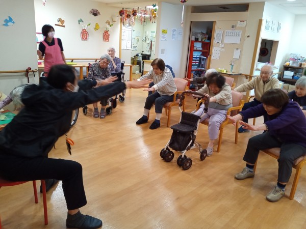 立ち上がり時の転倒予防と、身体を守るための反応力を鍛える手の曲げ伸ばしや、脳を目覚めさせたり手足の冷えを取り血行をよくするための手を叩く運動、食べこぼし防止の為の口の筋肉を鍛える運動などを行いました!