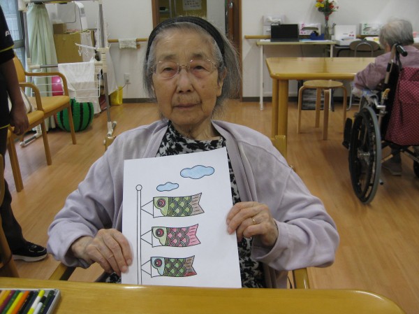 5月5日に向けて鯉のぼりの塗り絵を行いました( ^ω^)・・・ 《どの色にしようかしら? これがいいかな?》と考えながら職員に相談して完成していきました( ^)o(^ ) 「鯉のぼりあげたわね!」《兜も飾ったわね!》とお喋りしながら昔のことを思い出し嬉しそうにお話しされていました!(^^)!