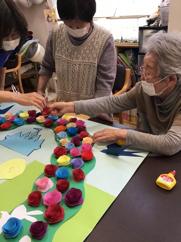 色合いを考えて土台にバラの花を貼っていただきます。
