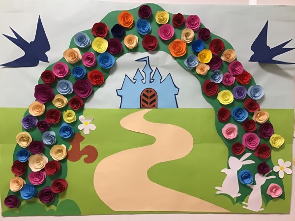おとぎ話の世界のようなバラのアーチがかかった壁画の完成です。