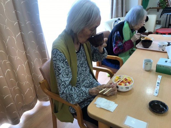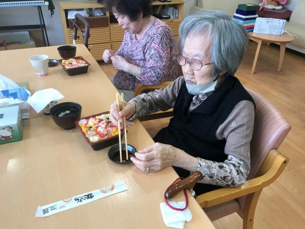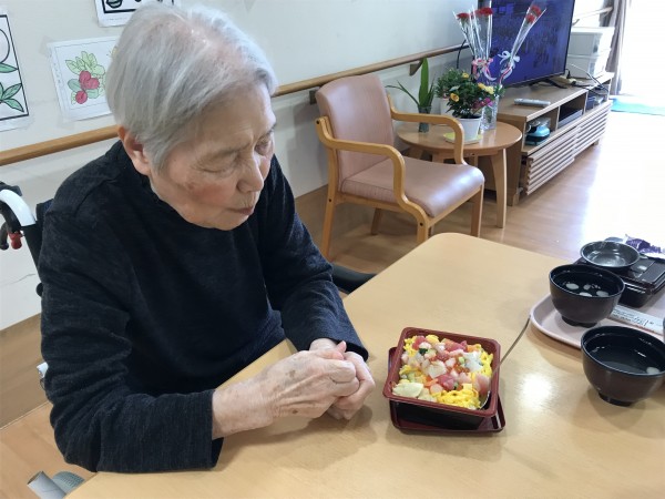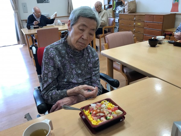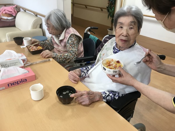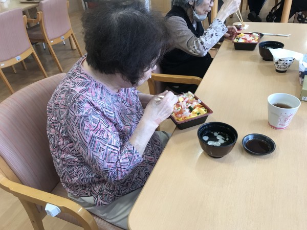 今年の母の日は5月14日ですね!食事レクとして、宅配のばらちらし寿司を注文して昼食に皆様にお出ししました♪皆様とても喜ばれて食が進んでいましたね!「今日は母の日ですね」とお声掛けすると、「そうなのね~」と控えめにほほえまれました♪一番下の画像は、13日の昼食でお品書き付きの特別メニュー食「母の日ありがとうメニュー」です♪おいしく召し上がって頂きうれしい限りです!