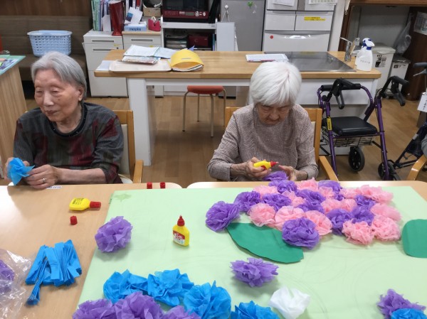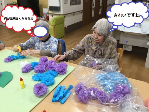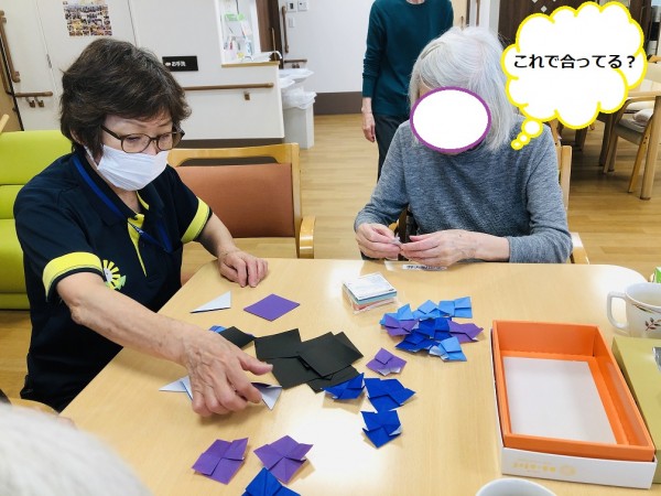 B様・T様も折り紙で作成中。T様も「あら~?撮ってるのー?恥ずかしいわね」と言われながらも目線はバッチリとカメラ目線です(^^)/