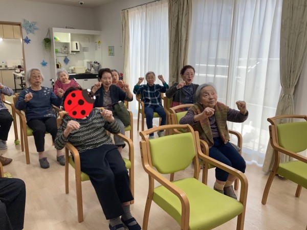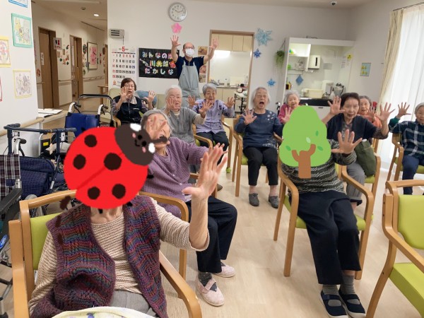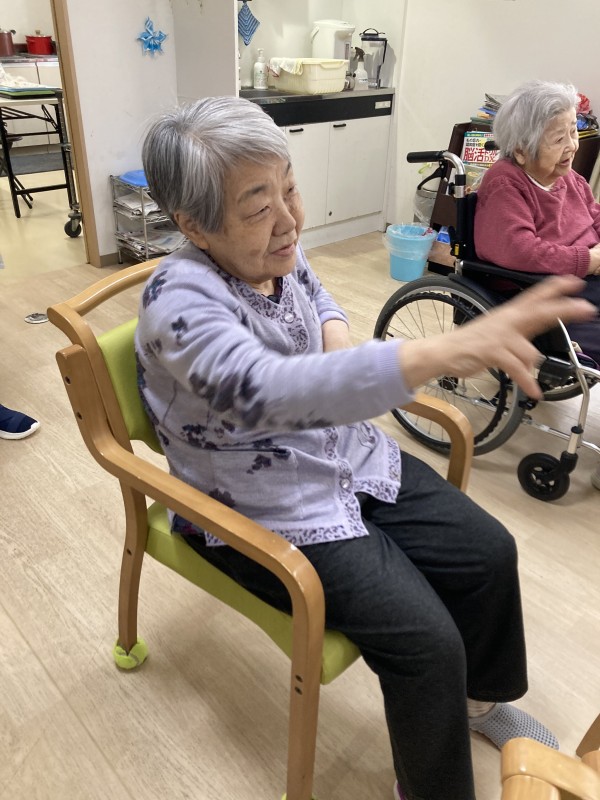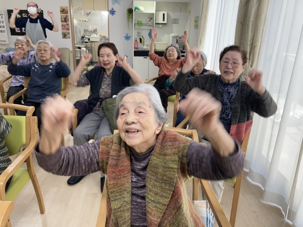 体操の先生を参考にしながら、ご利用者様の皆様が力いっぱい両手を上に伸ばしたり、拳を前にしたり…とてもよく頑張られておられました(^^♪