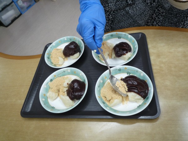 餡子ときなこの2種類のお団子が完成。
