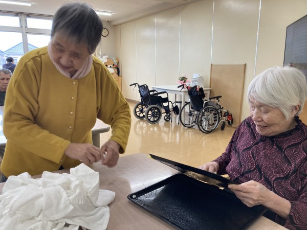 昼食に使ったトレーを洗って、拭く作業のお手伝いをお願いしました。おしぼりも乾いたみたいです。