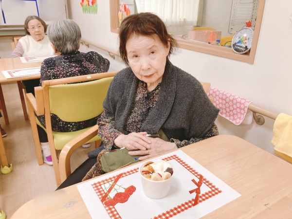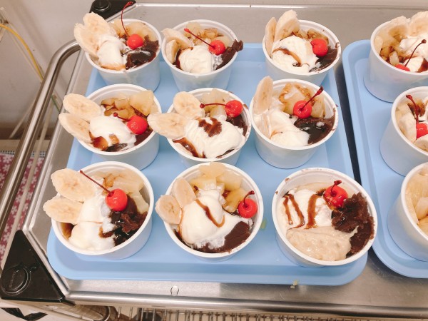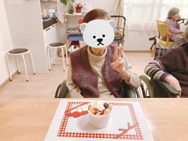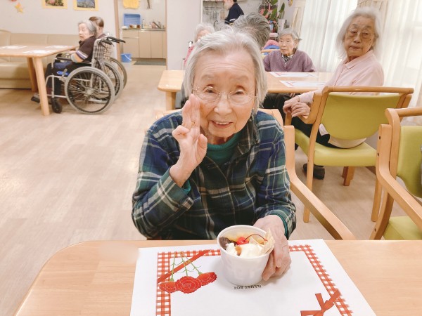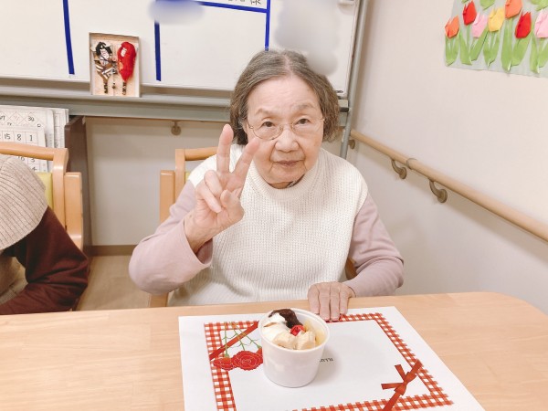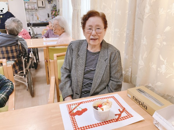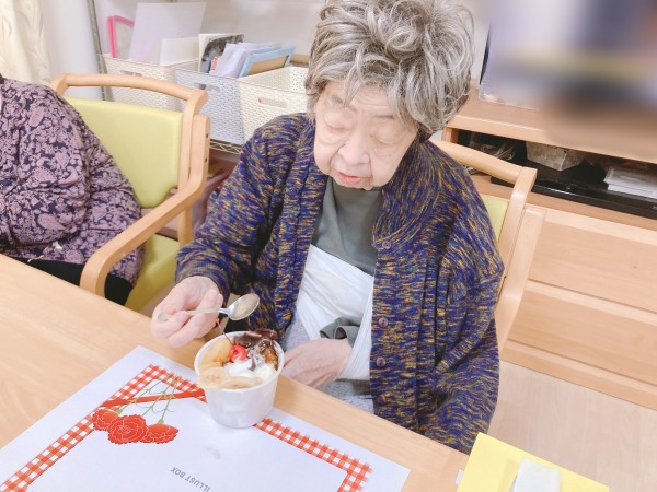 さくらんぼにバナナにアイスが乗ったあんみつ、職員手作りのお手紙とカーネーションをお渡しいたしました。