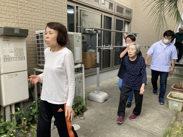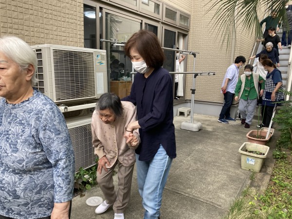 職位の通報訓練から始まり、ご利用者様は避難口、避難階段を使って駐車場まで避難していただきました。