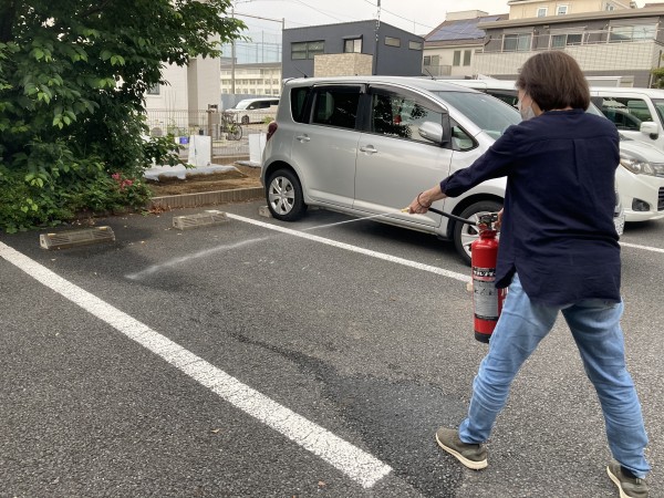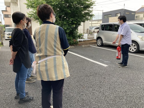 消火器訓練は、新職員を中心に操作方法を聞きながら実践しました。