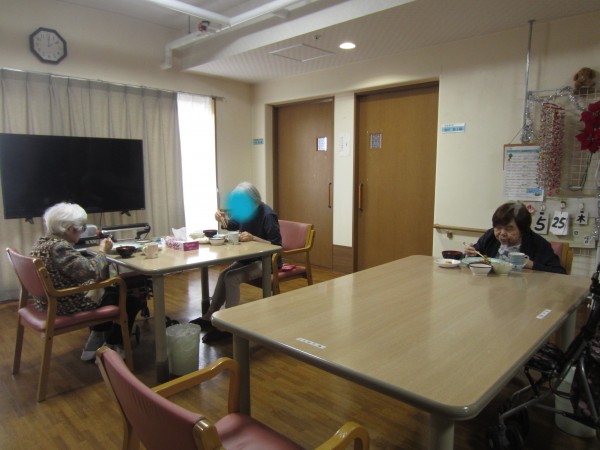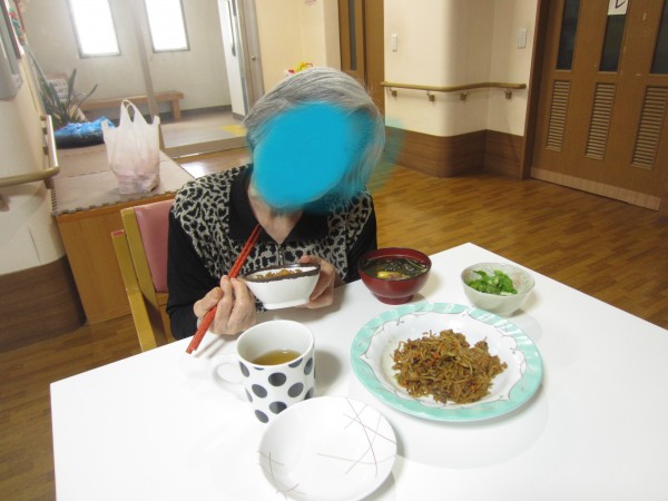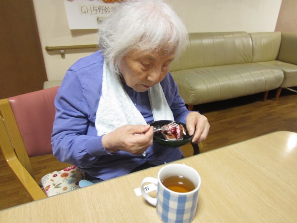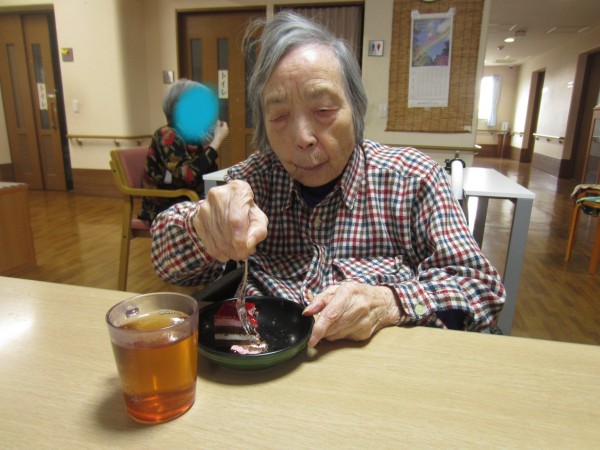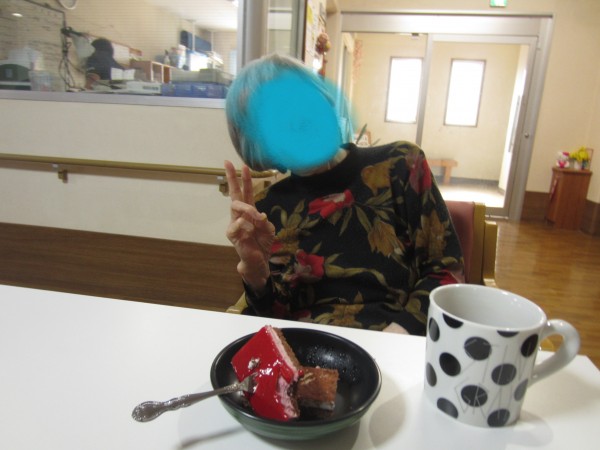 おやつのお時間にさくらんぼのケーキを召し上がりました。皆様が「甘酸っぱくて美味しいね。これ大好きなんだよ。」と美味しそうに召し上がっておりました。