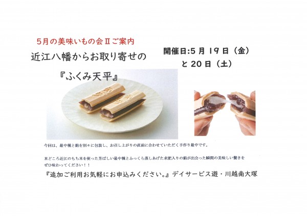 本日のおやつは【美味いもの会Ⅱ】です。今回は滋賀県近江八幡からのお取り寄せ、たねやさんの「ふくみ天平」です。求肥のはいった餡と最中を召し上がる直前に合わせていただく手作り最中です。米どころ近江のもち米をつかった最中種はいままで味わったことのないサクサク感と香ばしさです。今回もおいしく頂きました♪