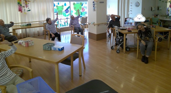 昨日は、三階で体操を行いました。食堂にて、しりとりゲームなども