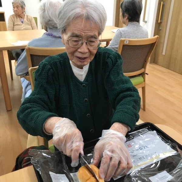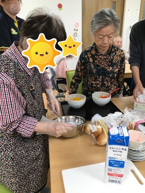 先日、おやつの時間に合わせて1,2階一緒にフルーツサンドを作りました。