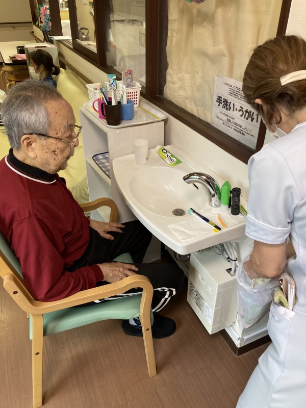 歯科衛生士さんのアドバイスに入居者様も真剣に耳を傾けながら口腔ケアを行っています。