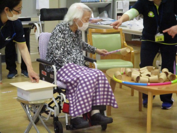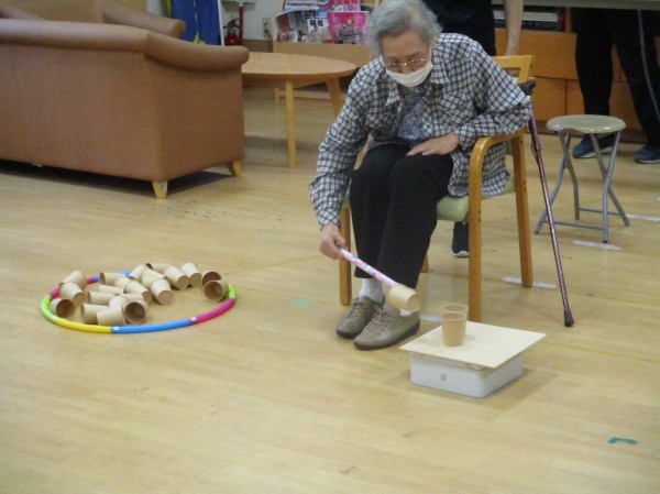 こんにちは!遊・西東京です。今日の運動レクレーションは『紙コップすくい』です!輪っかの中のコップを棒を使い左側の台の上に一番多く並べた方が優勝です!みんな頑張れ(^O^)/
