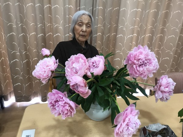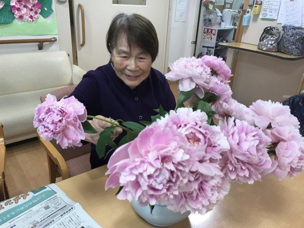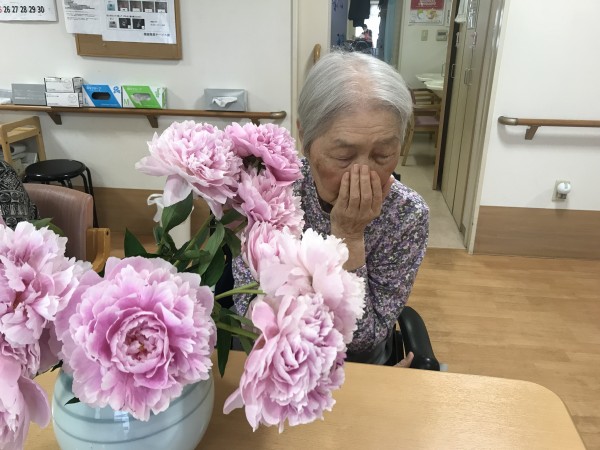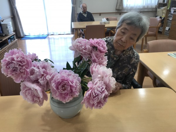 シャクヤクの花がホームに届き、蕾だった花も翌日には満開になりました♪大ぶりなお花に皆様「すごいわね~」「綺麗ね~」と感嘆の声を上げられました!香りも良かったですね!お花とのショットで素敵な表情が撮れました♪