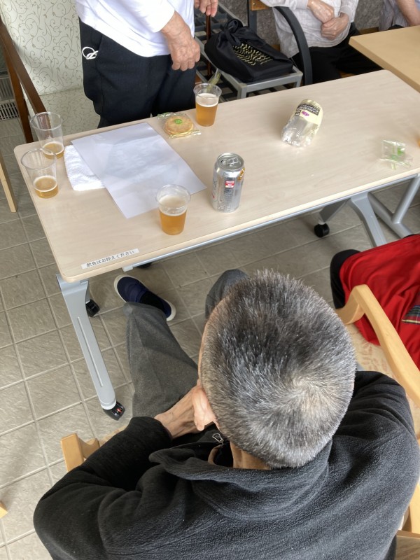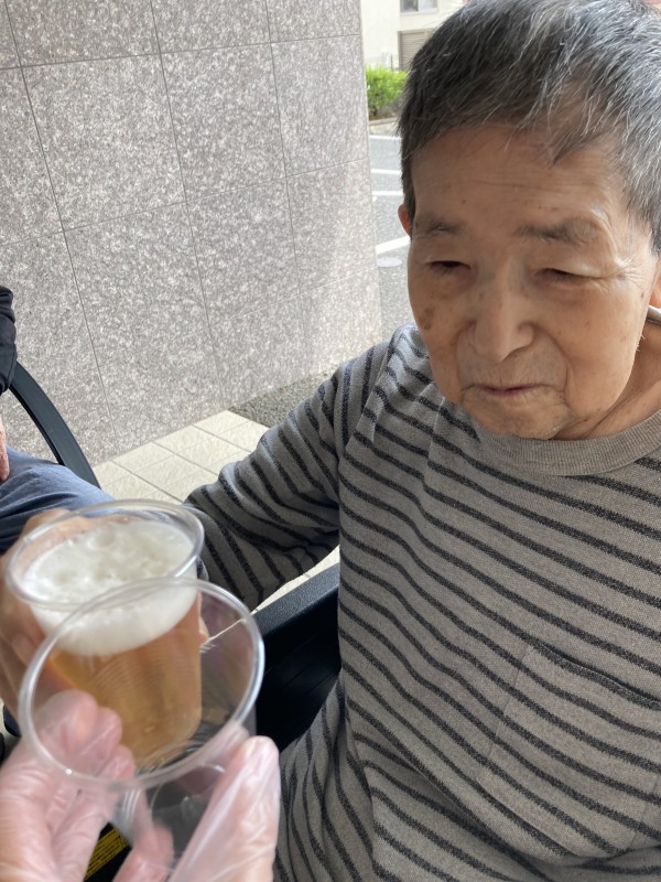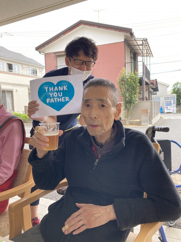 本日18日は父の日というところで男性入居者様に日頃の感謝をと思い玄関先で男子会を行いました。