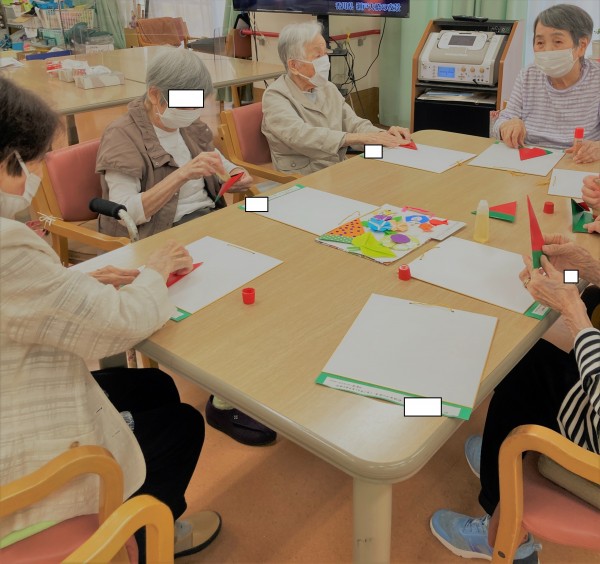見本を見ながら、どんなふうに貼っていますかねー。これはー・・・夏に合わせてのお花貼りでしょうか