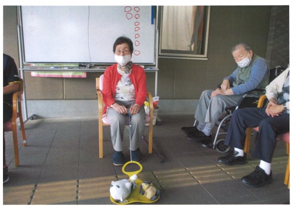 今回は、ぬいぐるみをそりに乗せて落とさないように引っ張るゲームです。ソリにひもが付いていてくるくると糸を巻いていくというもの。早く巻きすぎると振動でかわいいぬいぐるみが落ちてしまいます。慎重に糸を手繰り寄せなくてはなりません。楽しみながらも隣の方との競争になりますので大変盛り上がりました。