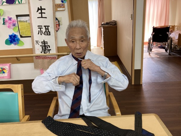 ホームの生活ではなかなかネクタイを締める事なんてないですよね。今回はせっかくなので素敵なネクタイ姿をみたーーい!と思い企画いたしました。まずはネクタイ選びから!!以前は会社員だったお2人。「おっ!!この色が良い!!」とI様はこちらのネクタイをチョイス!!