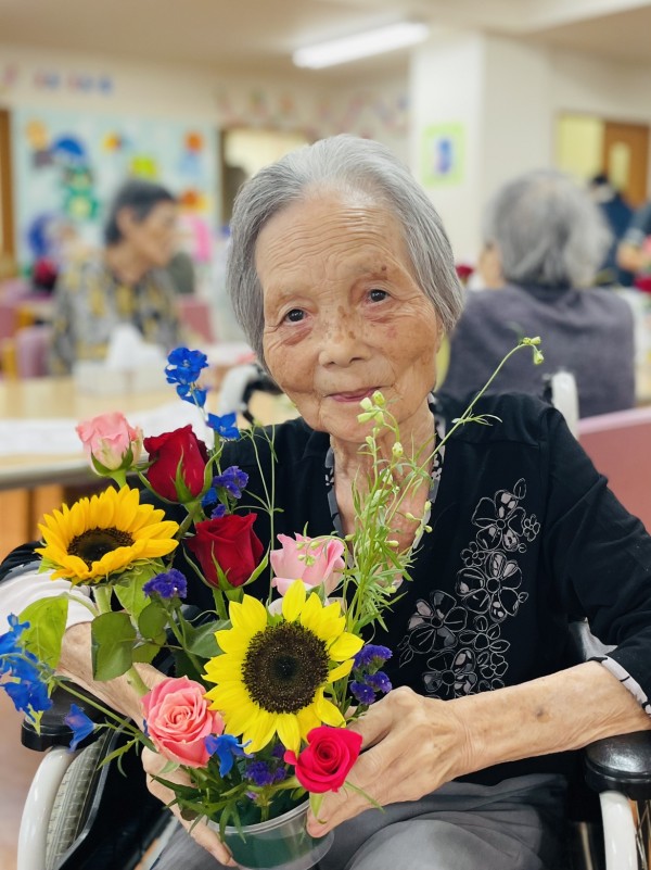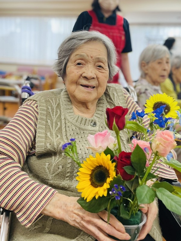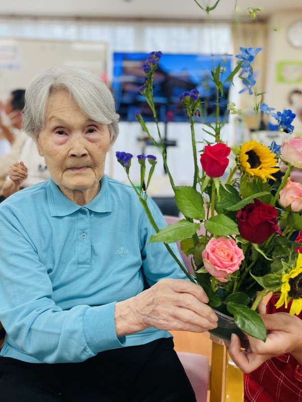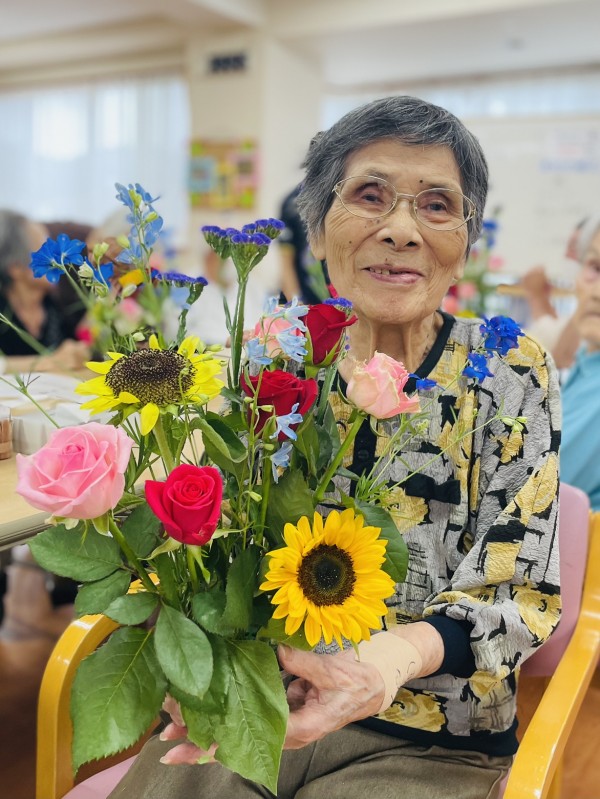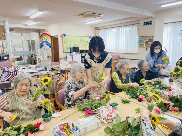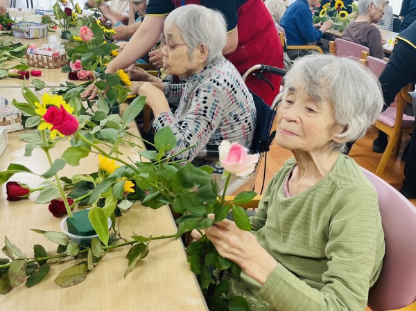 フラワーアレンジメント教室。。ここ数年で入居された方も多いので初参加の方や、デイサービスに通われていてその後グループホームに入居された方は顔なじみだったりと和やかな雰囲気のまま約一時間たっぷり、きれいなお花を生けました。
