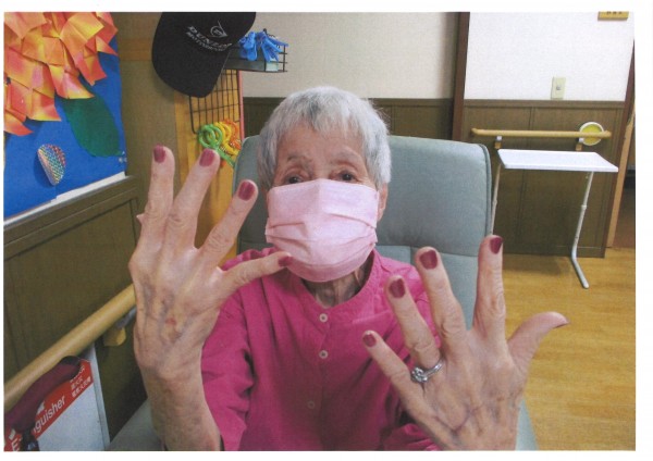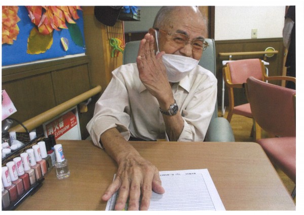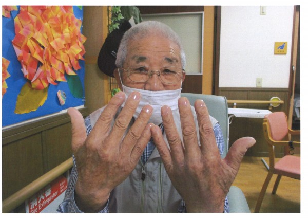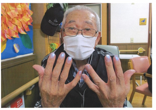 本日は【ネイルケア】の日。手の爪を整えお好きな色を爪にのせていきます。爪にネイルするだけで気分も上がりますね。男性は透明の爪の保護にもなるものをつけました。爪がピカピカになると男性も笑顔になりますね。初めて体験される方も多いので新鮮な感覚だといわれる方も。ピンクやブルーを付けた方もいらっしゃいます。色々な事を体験して、その感覚を味わうのも良い経験になりますね。女性陣もネイルを見せ合ってお話が盛り上がっていらっしゃいました♪