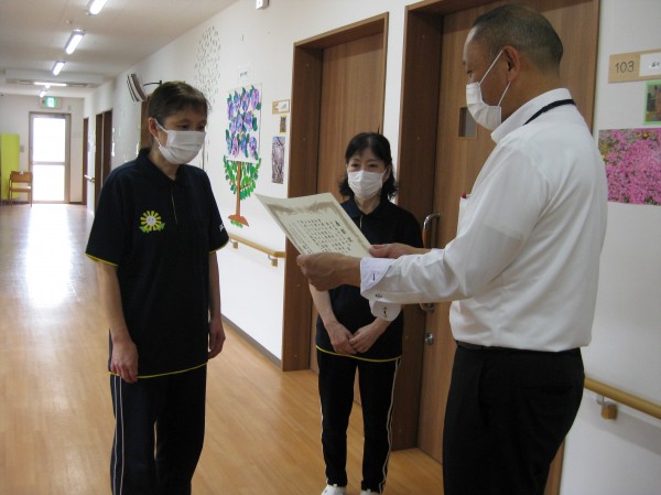 お一人の職員の5年勤続表彰がありました( ^ω^)・・・ 課長からの5年勤続表彰状を受け取られているご様子です。