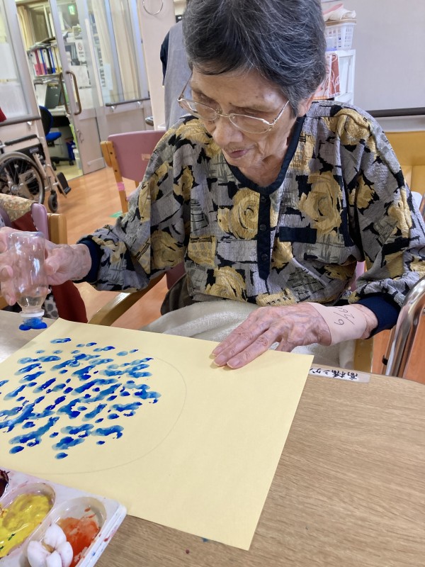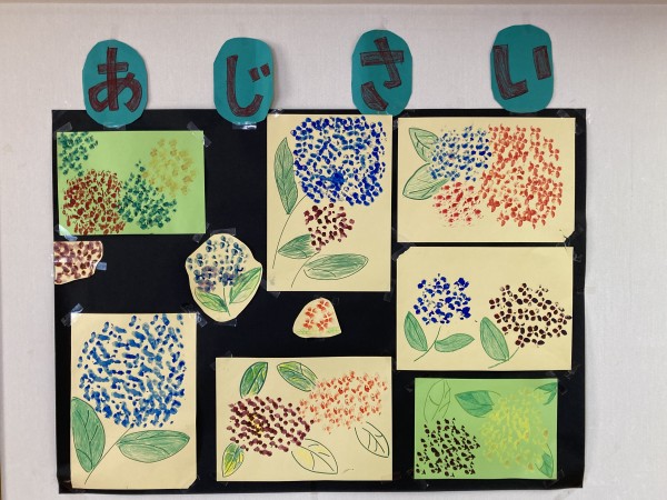 あじさいをメラミンスポンジと某ヨーグルトドリンクのペットボトルを使い、絵の具でぺたぺたして表現。