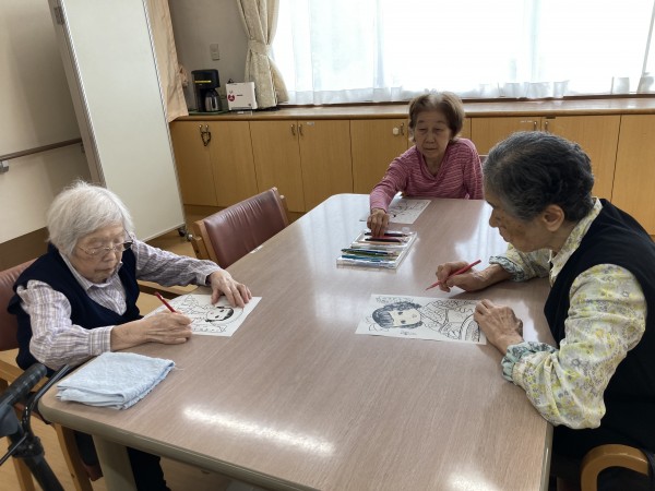 色鉛筆をテーブル毎に共用で使っていただきました。ご入居者様同士で相談しながら楽しく塗り絵を楽しんでいただきました。