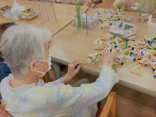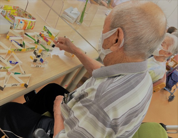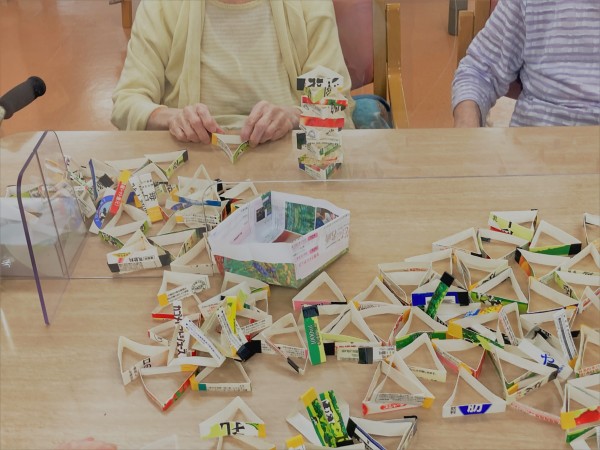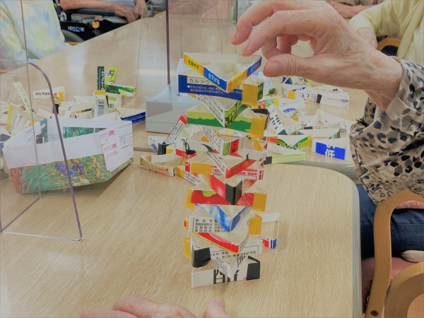 こちらですー。そう、これを見てピンと思い出しましたか?牛乳パックの積み立てとなります!崩れても時間のある限り積んでいきますよー