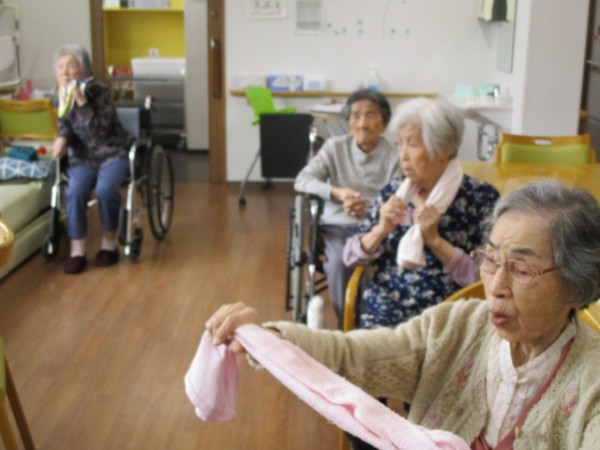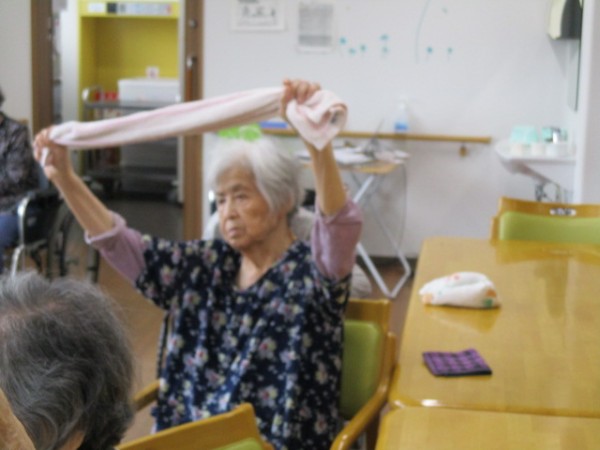 リモートALSOK体操(タオル体操)参加されているご様子です( ^ω^)・・・ タオルを使用して手がしっかりと上まで上がられていますね(*^。^*)