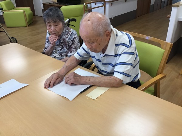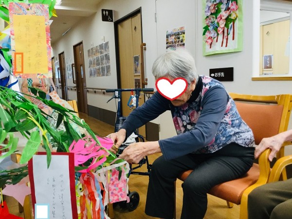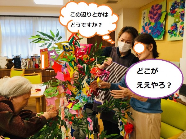 「どこがいいかな?」と短冊をどこに飾ろうか…。職員と一緒に考えながらA様飾り付けされていましたよ(^^♪