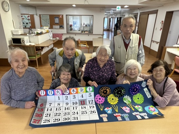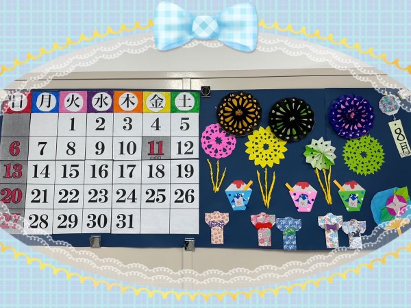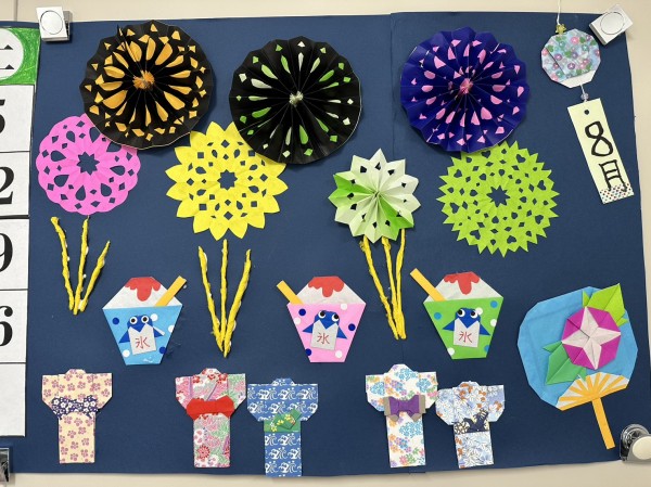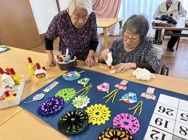 スタッフと一緒に、折り紙で『花火やうちわや風鈴』を作ったり、