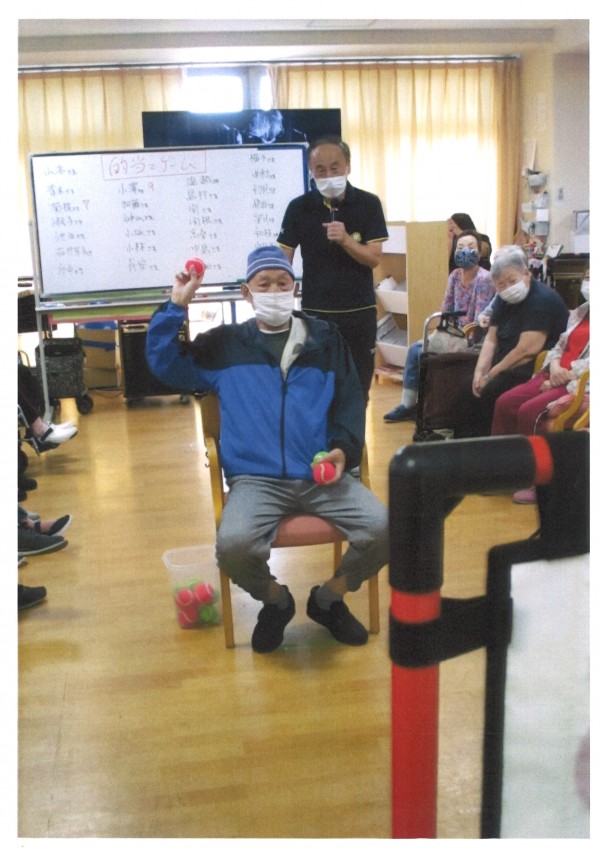 1~9の数字が書いてあるマジックテープのボードにテニスボールをなげて数を競うという的当てゲーム。皆様順番に投げていきホワイトボードに点数を書き出します。点数はそれぞれですがお互いに応援しあってゲームを楽しまれていました。最後は職員が挑戦、サービス精神旺盛な職員たちの激投で盛り上がりました。