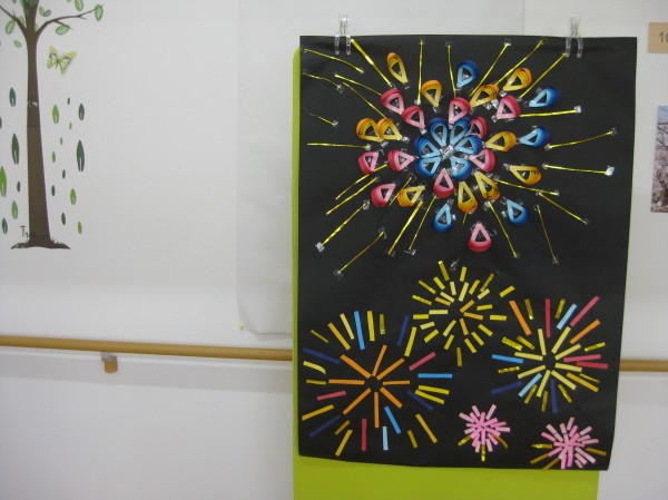 意外と綺麗だね(*^。^*) と大笑い!! 花火の貼り絵の完成です。金が光っていて最高( ^)o(^ )