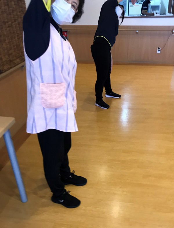 職員さんも参加しました。柔軟運動は介護職員には大事です。