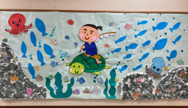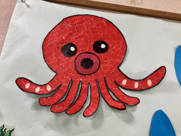 浦島太郎【またの名を“あり太郎”と名付けました(笑)】とタコ・イカを貼り絵をしていただき、とっても可愛く完成しました♡