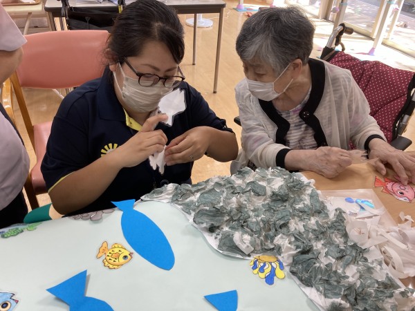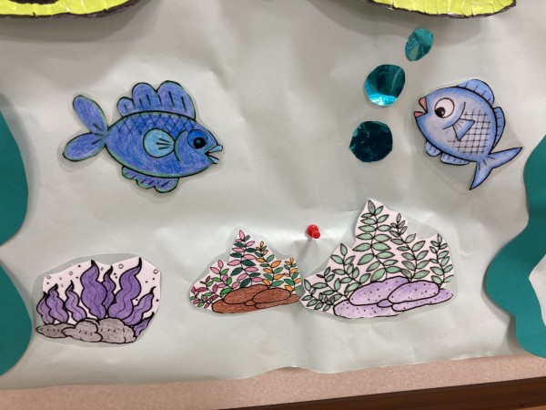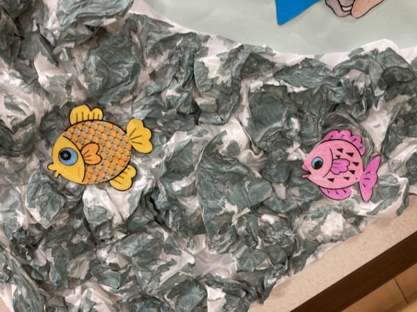 魚は画用紙を切ってもらったり、塗り絵でカラフルな魚も塗っていただきラミネートして完成しています☆彡