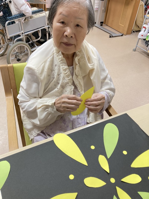 皆様で色紙を切ったり、貼ったりして花火のように飾りつけしました。