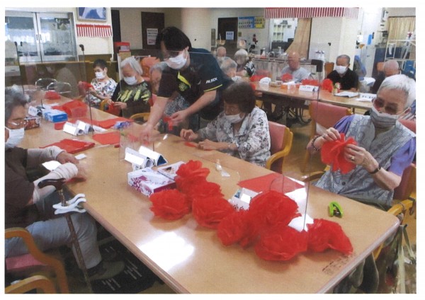 夏の大イベント【夏祭り】を盛り上げるため、ご利用者の皆様に飾りを作っていただきました。紅白のお花紙で沢山のお花ができました。紅白の幕やちょうちんでお祭り気分も盛り上がりますね。今からお祭りが楽しみです♪