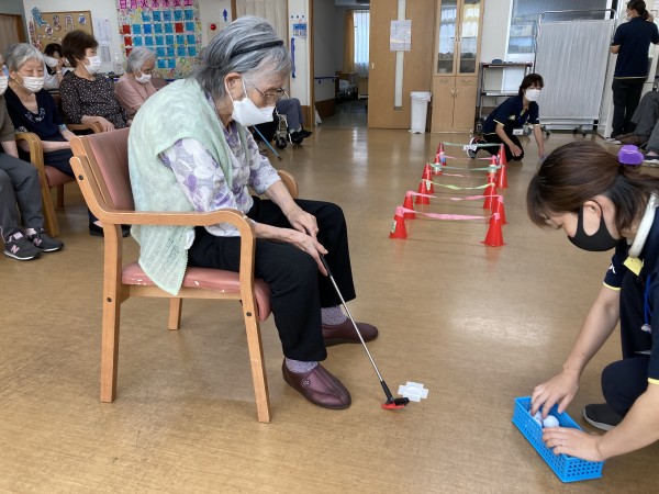 ゴルフのパットで、ピンポン玉やゴルフボールを打って、より多くのゲートの中をくぐるほど点数が高くなります。