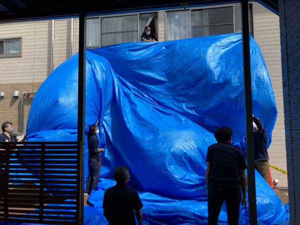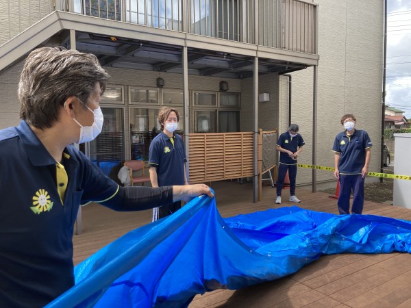 最初の大仕事!ブルーシートで屋根作り!