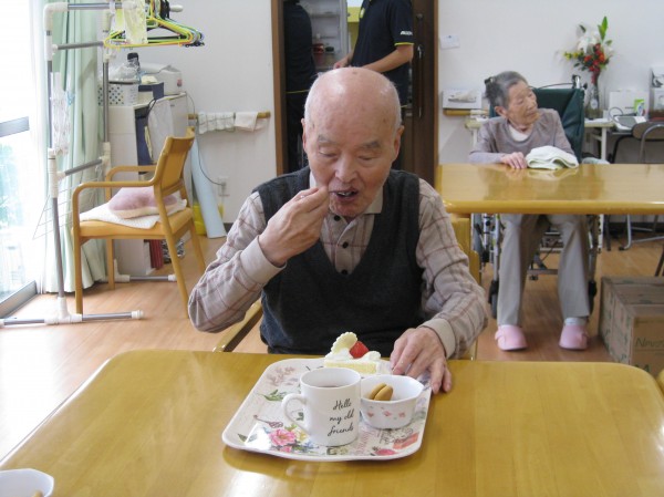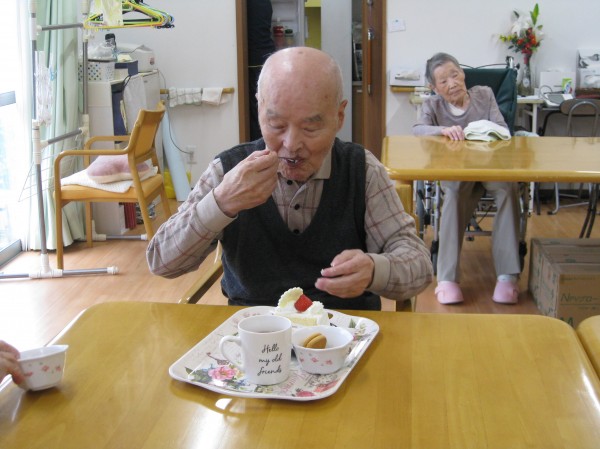 ご家族様がお持ちくださいましたケーキを召し上がられています(*^。^*)