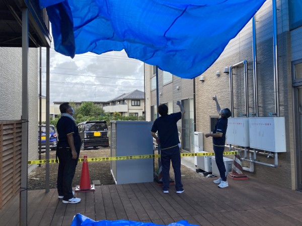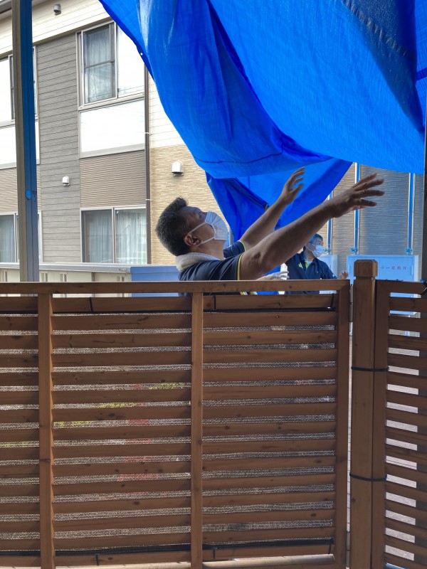 日除け用シート張り‼当日は風が強くなってきて男性スタッフ総出による作業‼