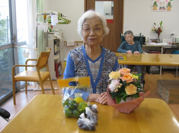果物:葡萄にみかんをお持ちくださいました(*^。^*) 頼んだの? と喜んでおられました( ^)o(^ ) 「ここ開かないの? 外で会いたいわ?」と寂しそうでした。