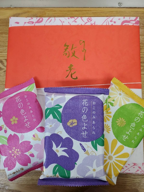 敬老会が終わった後、紅白まんじゅうとおせんべいを