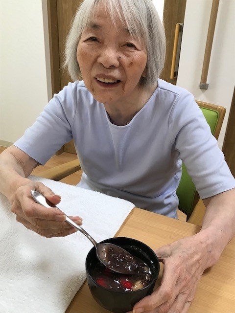 9/18敬老の日。おやつに「紅白 白玉ぜんざい」を作りお祝いさせて頂きました。