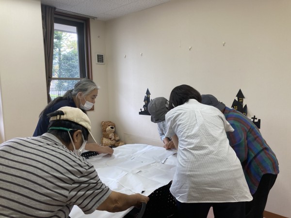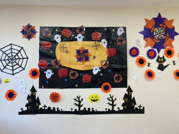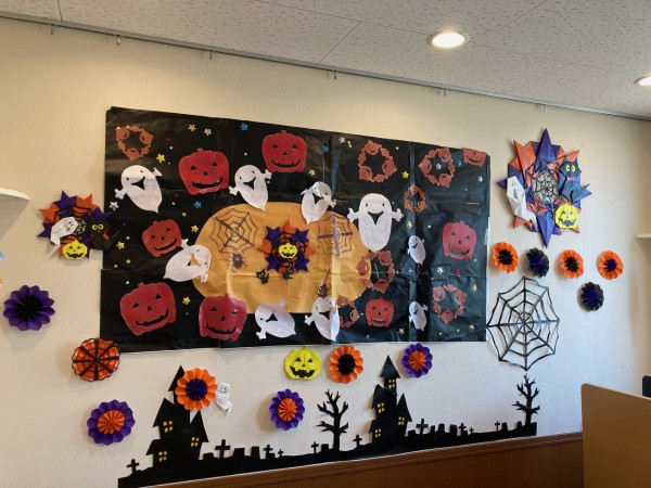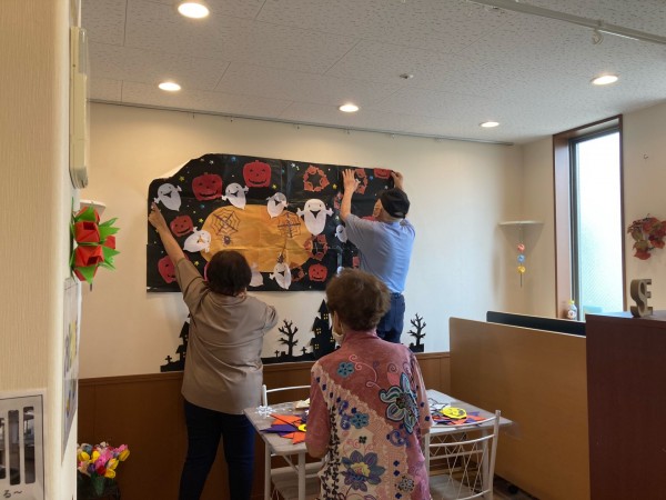 せせらぎ前でのラジオ体操後に、5名のボランティアさんのご協力のもと事務所内の壁面に10月の飾り付けをしました。