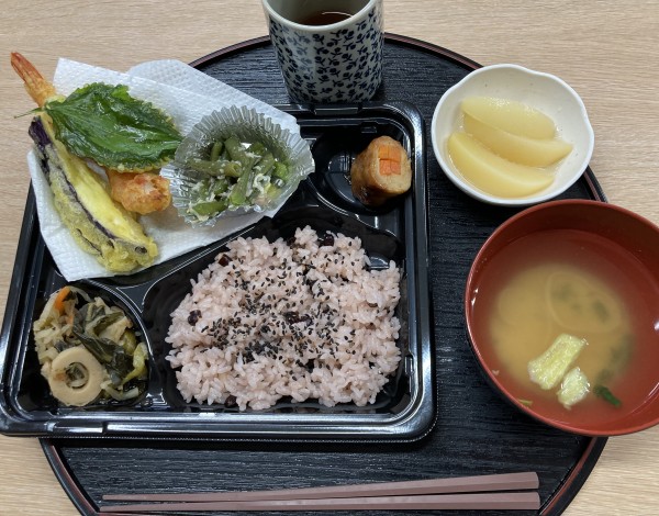 お赤飯・茄子、大葉、海老の天ぷら・野菜のつくね巻・和え物・お浸し・お味噌汁・白桃