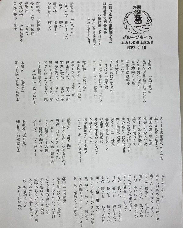 今年の敬老会はなんと約4年振りにご家族様、相撲甚句というボランティアさんをお招きさせていただきました(*^▽^*)